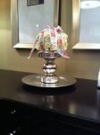 Originally it was placed on a red bowl upside down, so that any moisture dripping from the florist block wouldn't ruin the surface of a table. In the picture above it was tweaked and placed on a candle holder above a silver plate.